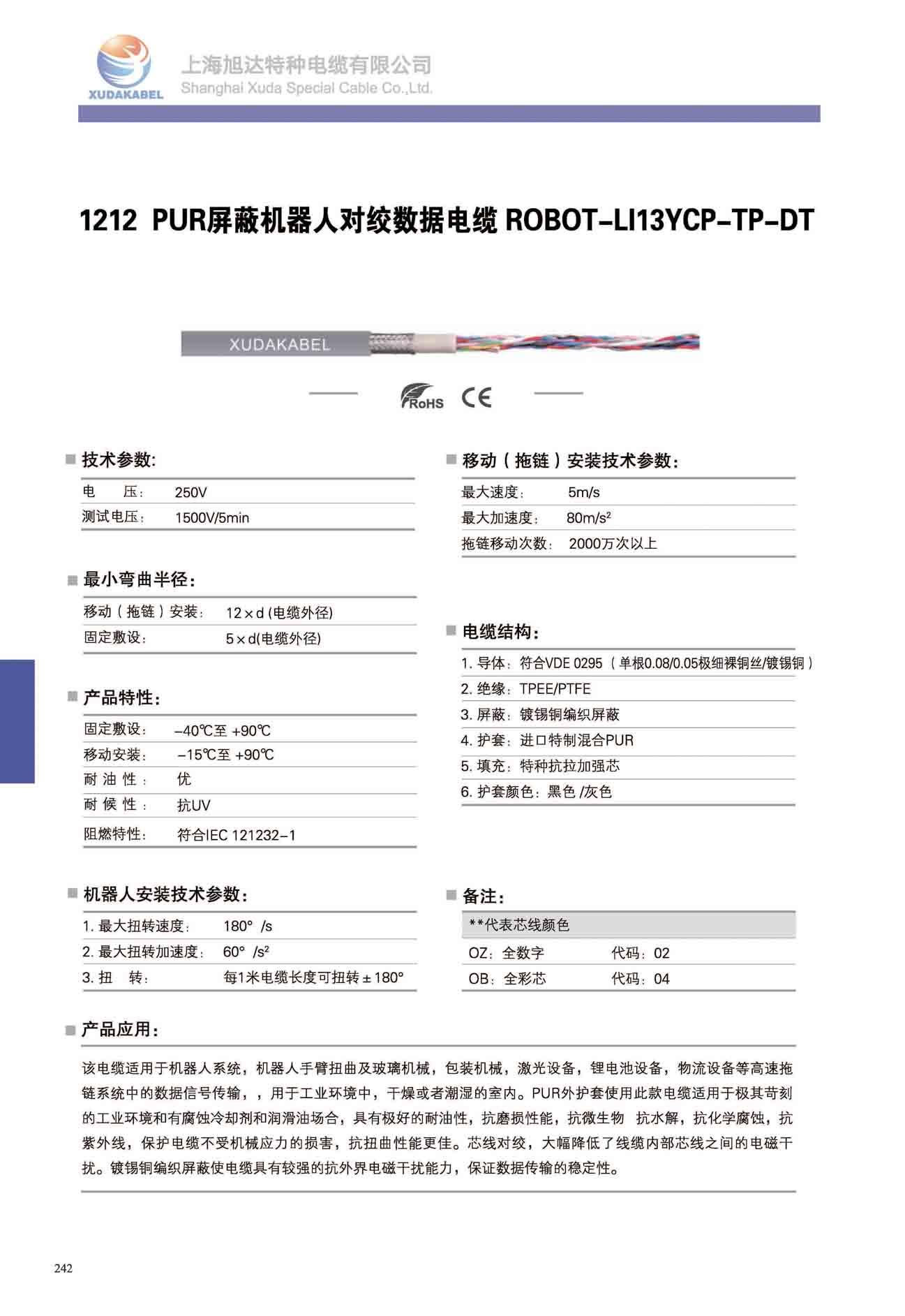 产品简介:该电缆适用于机器人系统,机器人手臂扭曲及玻璃机械,包装机械,激光设备,锂电池设备,物流设备等高速拖链系统中的数据信号传输,用于工业环境中,干燥或者潮湿的室内。该电缆护套采用特制混合PVC,具有良好的柔软性,抗扭曲性能更佳,芯线对绞,大幅降低了线缆内部芯线之间的电磁干扰。镀锡铜编织屏蔽使电缆具有较强的抗外界电磁干扰能力,保证数据传输的稳定性。